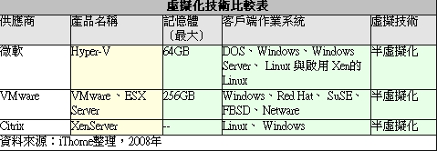 微軟新一代虛擬化技術Hyper-V,採取與VMware及Xen相同的半虛擬化技術,目前釋出的版本已可做到虛擬機器的叢集運算架構,但是虛擬機器線上移轉的功能,目前微軟還不及VMware的VMotion。不過,微軟將以低價策略搶攻市場,微軟大型企業業務暨經銷事業群專案技術部專案技術副理周伯彥說:「VMware授權費太高,價格將是Hyper-V拓展市場的利器。」